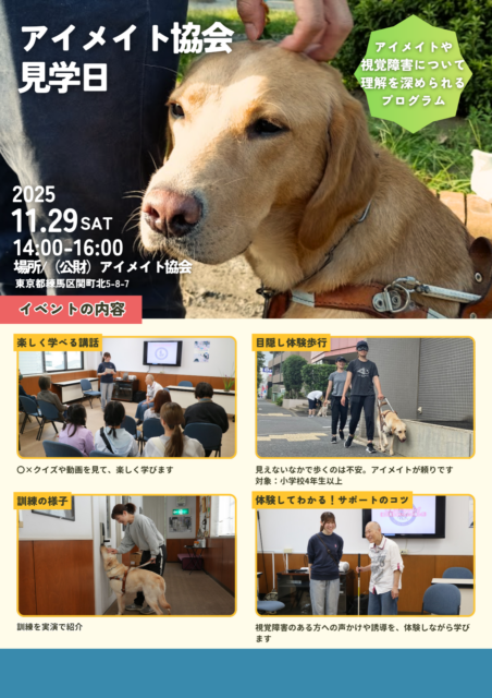 さて、11月29日(土)にアイメイト協会見学日を開催いたします。