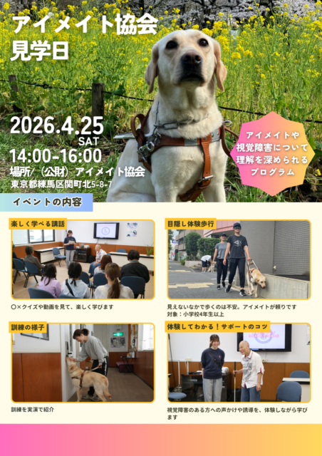 さて、4月25日(土)にアイメイト協会見学日を開催いたします。