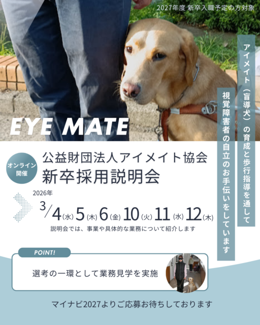 アイメイト協会では、2027年度職員採用(新卒)を予定しています。