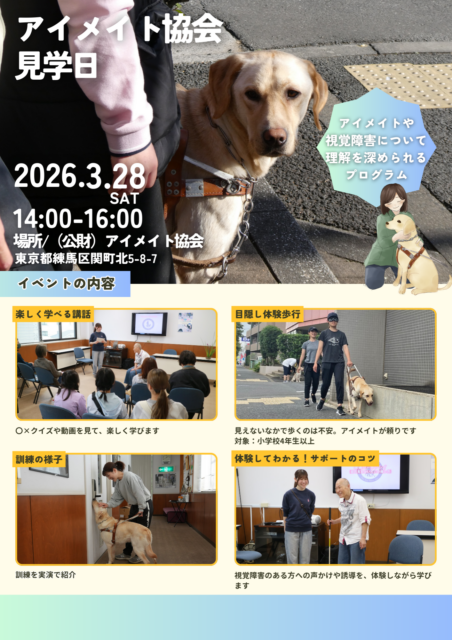 さて、3月28日(土)にアイメイト協会見学日を開催いたします。