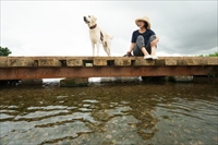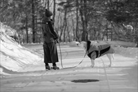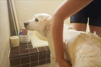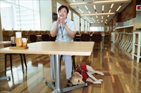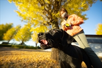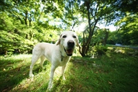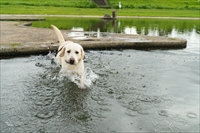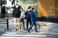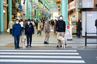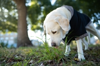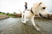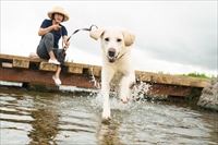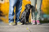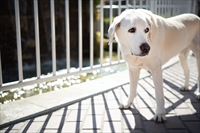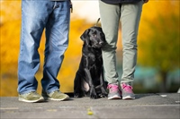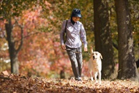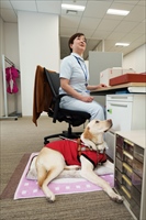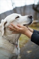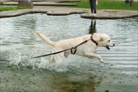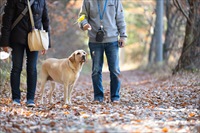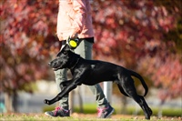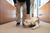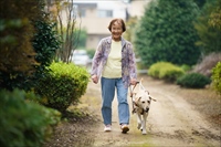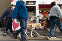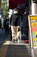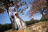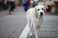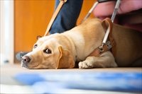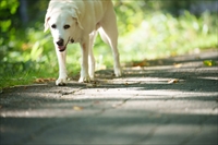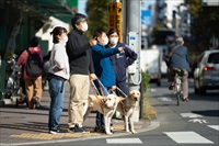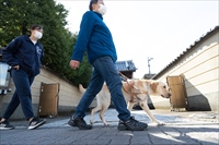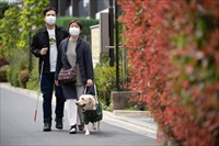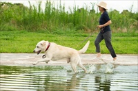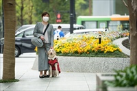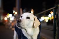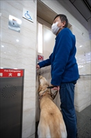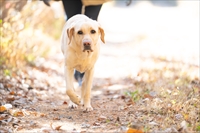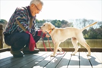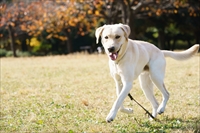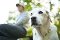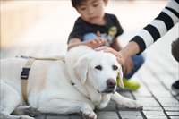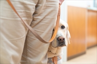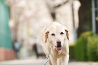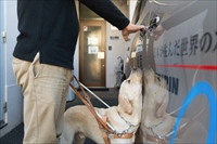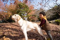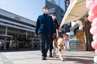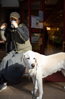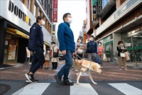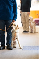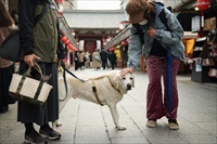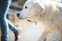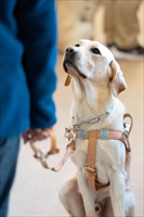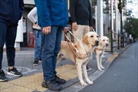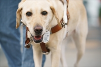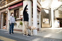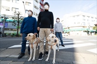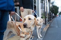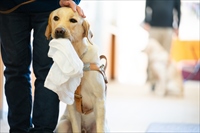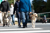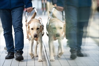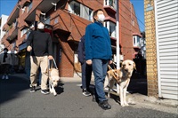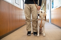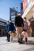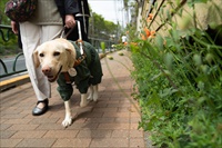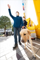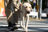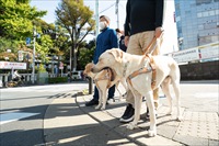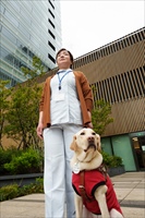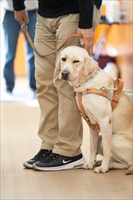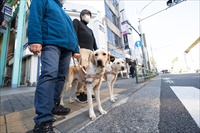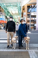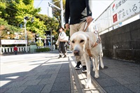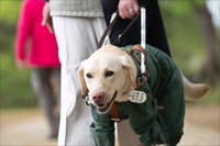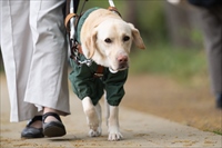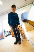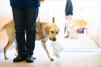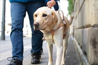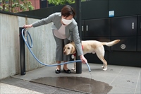 アイメイトは、目が不自由の人の目となり、歩行を助けます。障害物を避け、道路の分岐や段差の前で止まるほかに、いす、ドア、信号のボタンなどを探して鼻先で教えることもできます。「フェッチ」という声符(声による指示)で、落とし物を拾う訓練もしています。