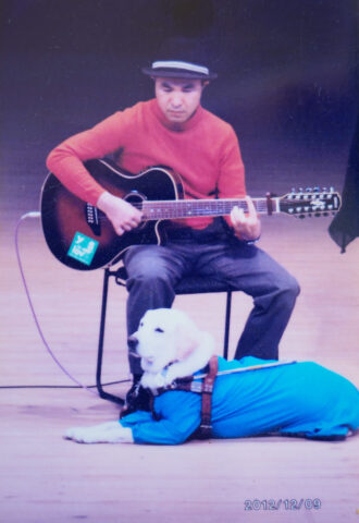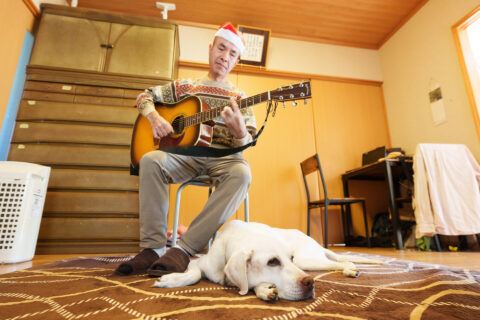 ご自宅を訪ねた時には、クイニョンはポカポカと南国の陽光が差す縁側でまどろんでいた。やがて話が弾んで蔵元さんが趣味のギター演奏を披露すると、ゆっくりと歩いてきて、蔵元さんの足元に伏せた。優しいメロディーが心地良さそうだ。「ギターと同じくらい旅行も好きです。小さい夢ですが、東京まで陸路で行ってみたいとずっと思っていました。福岡から東京行きの高速バスがあって、それに乗ってみたかったのです。ただ、狭い所に長時間じっとしていることになる旅にアイメイトを付き合わせるのは気が重い。だから、これまでは実現できませんでした」。